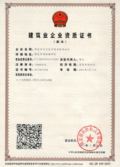 2016年4月,天河電子取得河北省住房和城鄉(xiāng)建設(shè)廳頒發(fā)的建筑智能化工程專業(yè)承包貳級資質(zhì)。