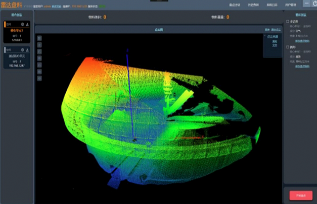 斗輪機(jī)盤料儀部署在斗輪機(jī)臂架兩端,內(nèi)置盤料儀嵌入式程序。通過臂架動 作帶動斗輪機(jī)盤料儀對其下方的料堆進(jìn)行掃描,同時從系統(tǒng)服務(wù)器實(shí)時獲取斗輪 機(jī)的走行位置、旋轉(zhuǎn)角度、俯仰角度及臂架的旋轉(zhuǎn)方向等維度定位數(shù)據(jù),將掃描 數(shù)據(jù)轉(zhuǎn)換為料堆的三維坐標(biāo)點(diǎn)數(shù)據(jù),并將獲得的三維坐標(biāo)點(diǎn)信息上傳至雷達(dá)應(yīng)用 單元進(jìn)行處理.....